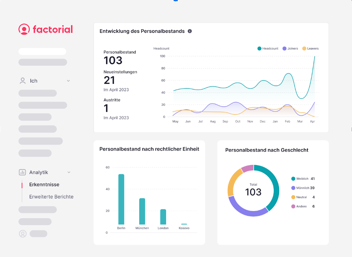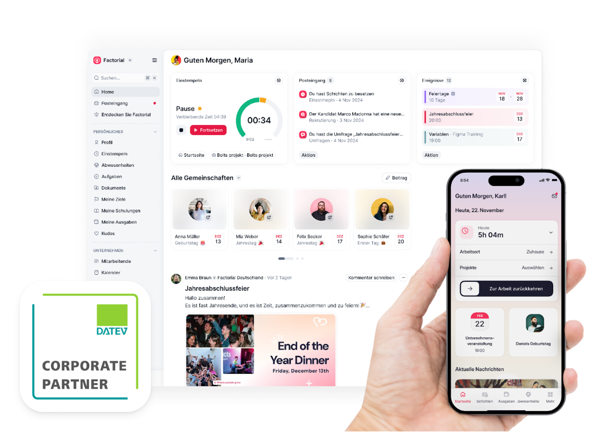 Für Deutschland bietet Factorial eine offizielle DATEV-Marktplatz-Schnittstelle (z. B. für eAU sowie Stamm- und Bewegungsdaten) und erleichtert so die Zusammenarbeit mit interner Lohnbuchhaltung oder Steuerberatung.