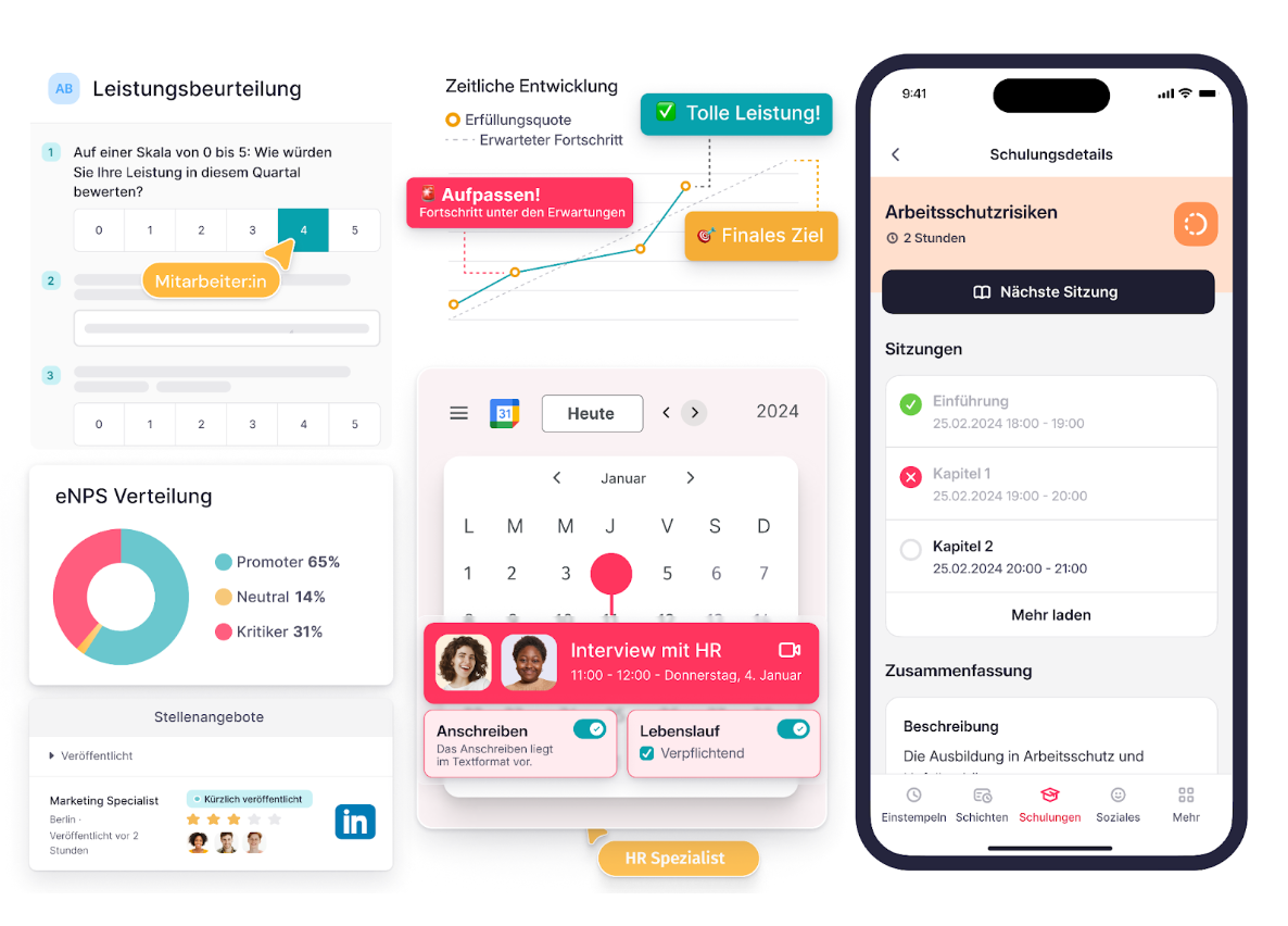 Zeit & Organisation (Zeiterfassung, Abwesenheiten, Schichtplanung), HR Core & Operations (digitale Personalakte, Dokumente, Vorlagen, rechtsverbindliche E-Signatur), Employee Lifecycle (Recruiting, Onboarding & Offboarding, Trainings & LMS, Performance-Reviews, Ziele & Kompetenzen) sowie Finanz-Workflows (Ausgaben- und Reisekostenprozesse, Projektverwaltung, Reports). IT- und Beschaffungsprozesse wie Lizenzmanagement und Beschaffung sind ebenfalls abbildbar; IT-Inventar-Funktionen sind je nach Paket/Release verfügbar.